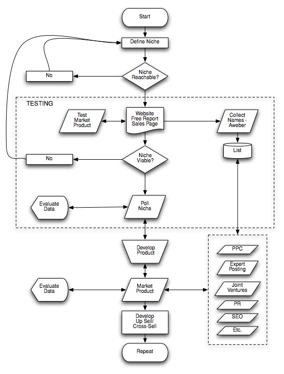 Is there a product development flow chart? Can product development be boiled down into easy steps? This article looks at one approach. The following flow chart is a simplistic look at the steps needed for launching a product via the Internet. Each box has had dozens of books written about that particular aspect of the process. If you'll notice, product development actually is quite small compared to the rest of the Internet marketing picture. Do not make the mistake of developing a product that no one is interested in. Testing is a huge component of any successful launch. Any "How-To" video producer should first evaluate if the niche (audience) is reachable. Then you must determine if there is interest in what you want to deliver. A simple web site or "squeeze page" can help you identify if: